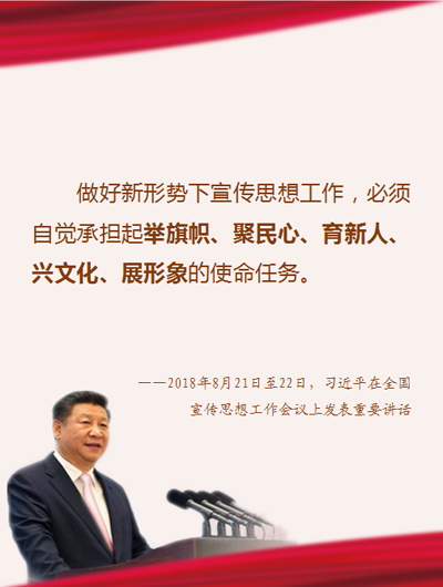 4、做好新形势下宣传思想工作,必须自觉承担起举旗帜、聚民心、育新人、兴文化、展形象的使命任务。