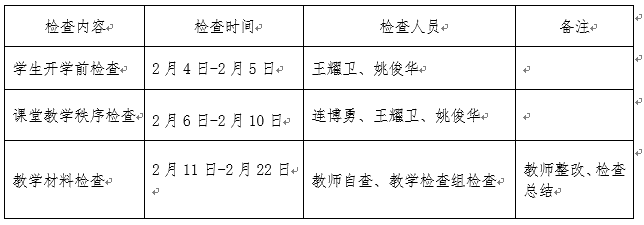 教学任务的落实情况:有无漏排、少排课程,有无人员、场所、时间方面的冲突等排课合理情况、任课教师课程表及教师用书到位情况。(责任人员:秘书、全体教师)